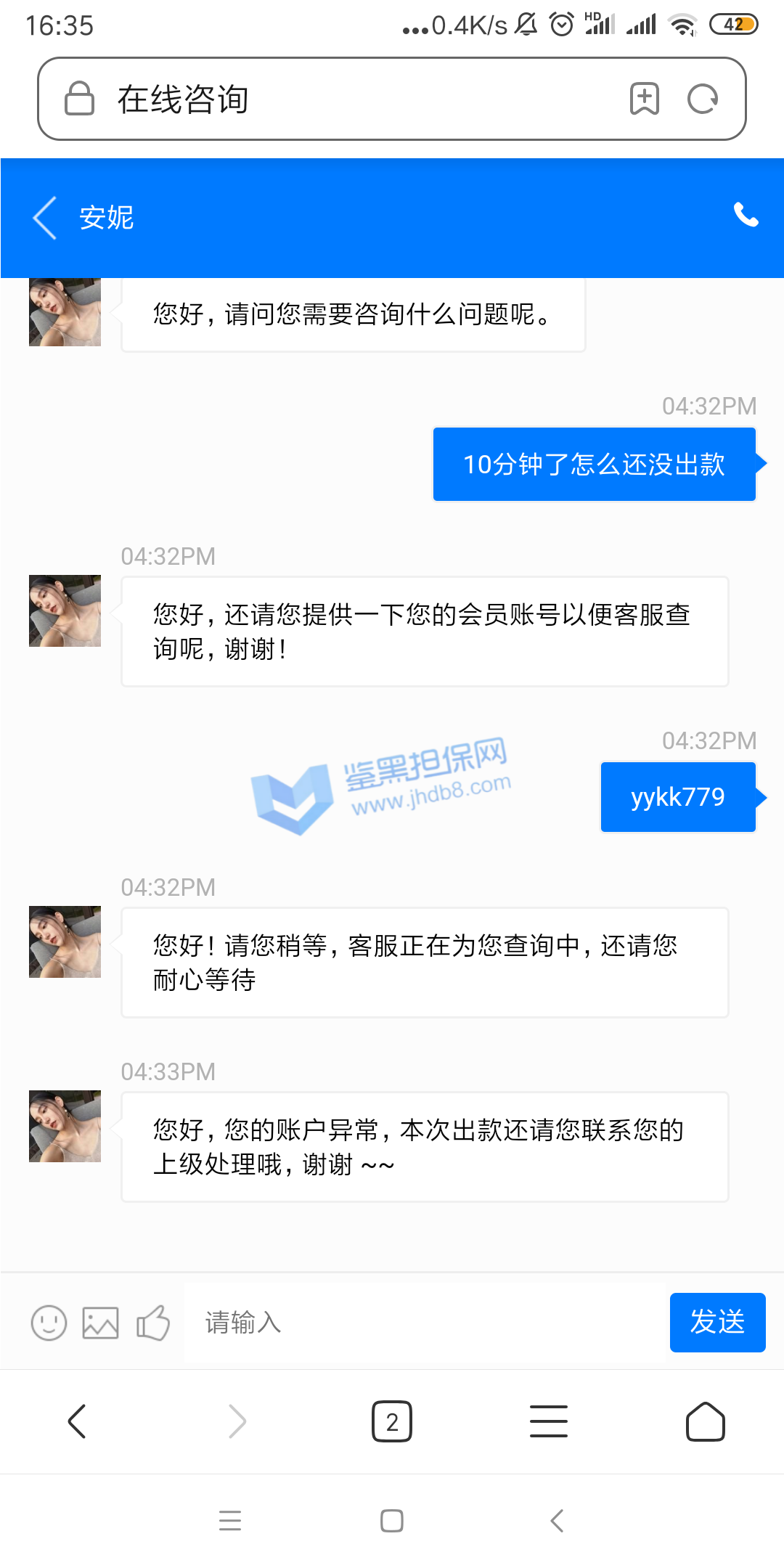 4.用户提交维权需为本人提交,若代替让人发布维权鉴黑担保网将拒绝受理;