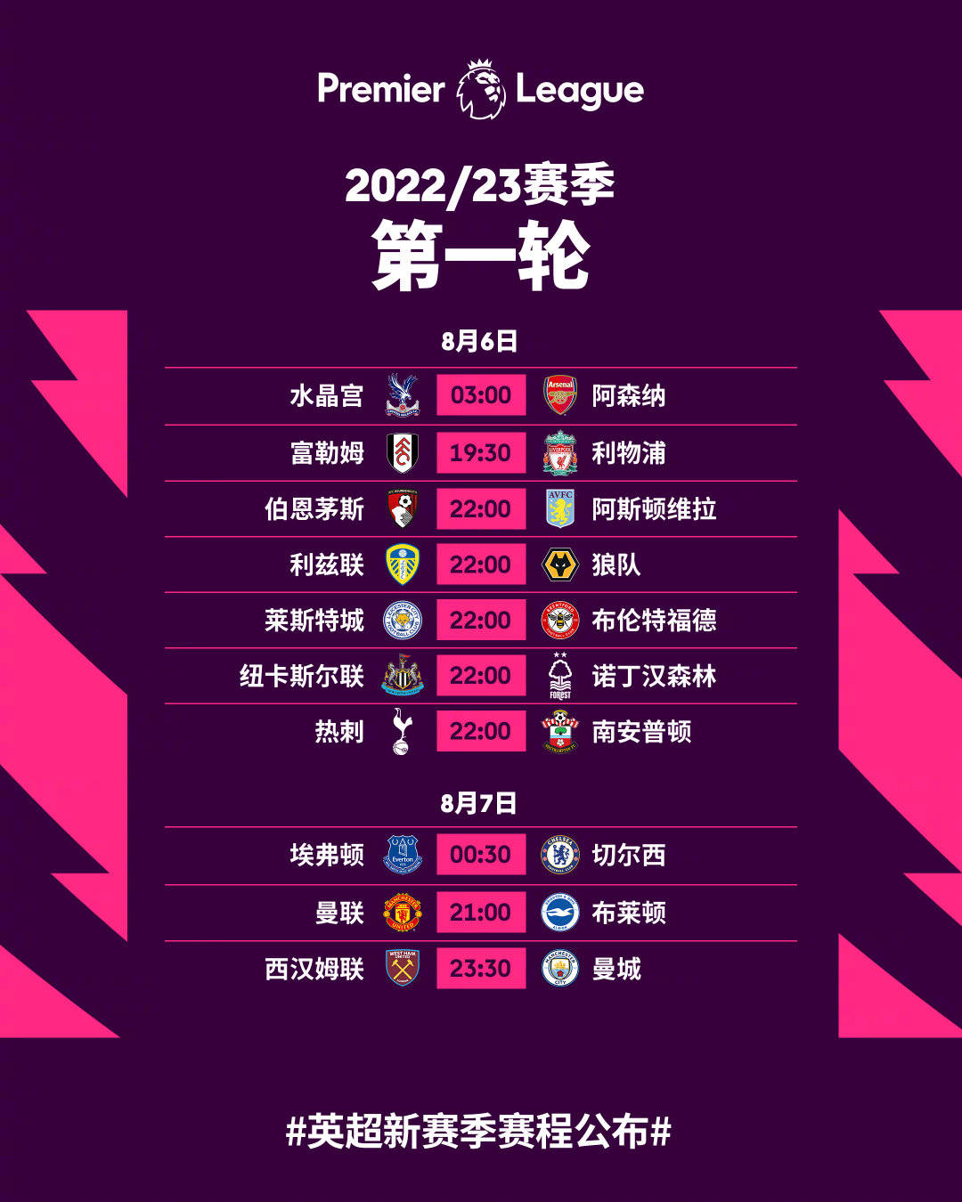 英超第1轮赛程: